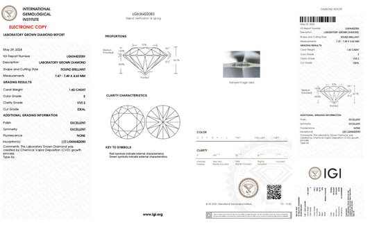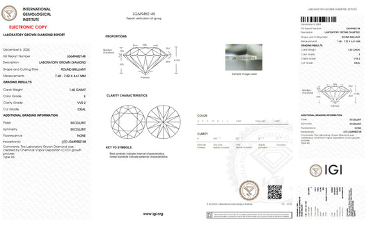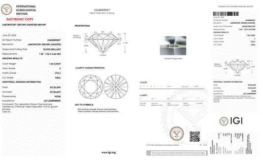 1.60 CT. Round VVS2 Clarity / E Color IGI Certified Lab Grown Loose Diamond.