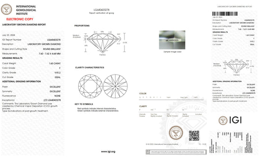 1.65 CT. Round VVS1 Clarity / E Color IGI Certified Lab Grown Loose Diamond.
