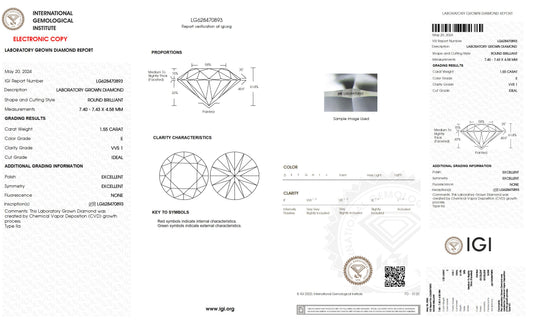 1.55 CT. Round VS1 Clarity / E Color IGI Certified Lab Grown Loose Diamond.