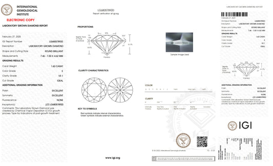 1.60 CT. Round VS1 Clarity / E Color IGI Certified Lab Grown Loose Diamond.