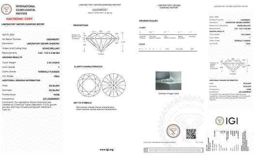 3.33 CT. Round IF Clarity / F Color IGI Certified Lab Grown Loose Diamond.