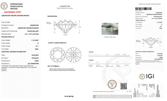 1.12 CT. Round VS2 Clarity / E Color IGI Certified Lab Grown Loose Diamond.